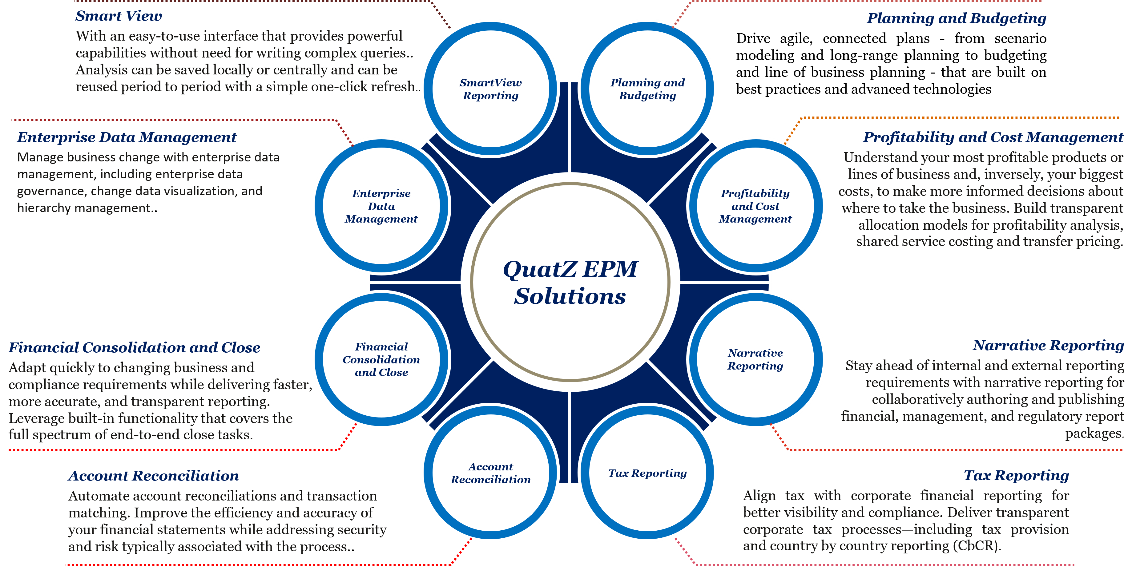 To address these challenges head-on, we specialize in delivering comprehensive Enterprise Performance Management (EPM) implementation services tailored to optimize planning, budgeting, reporting, consolidation, and metrics alignment. Leveraging top-tier EPM applications, we empower organizations to translate strategy into tangible results and maximize shareholder value.
